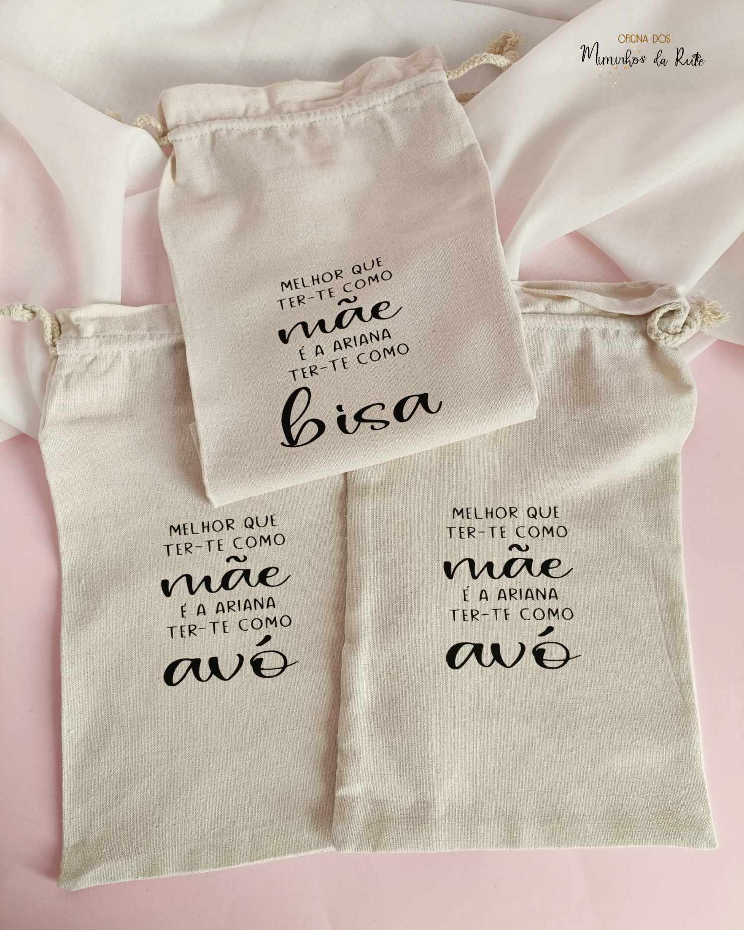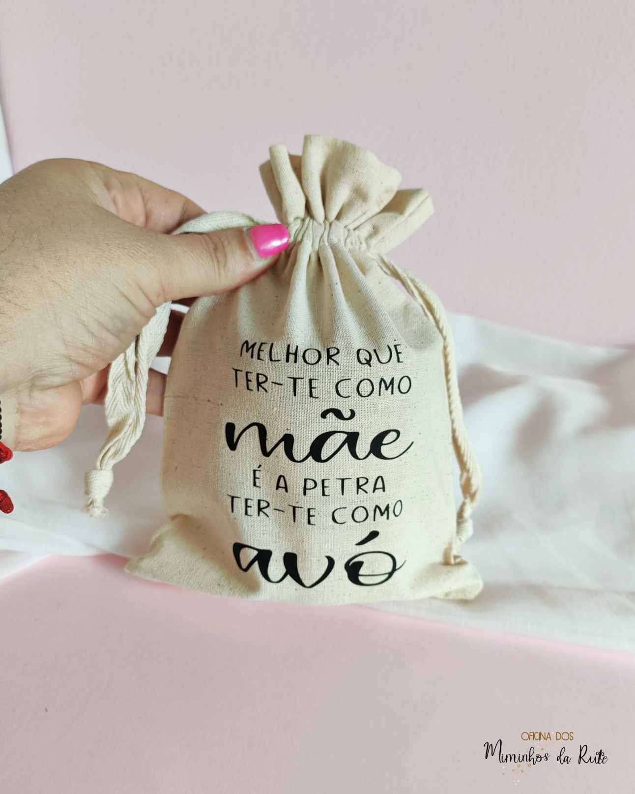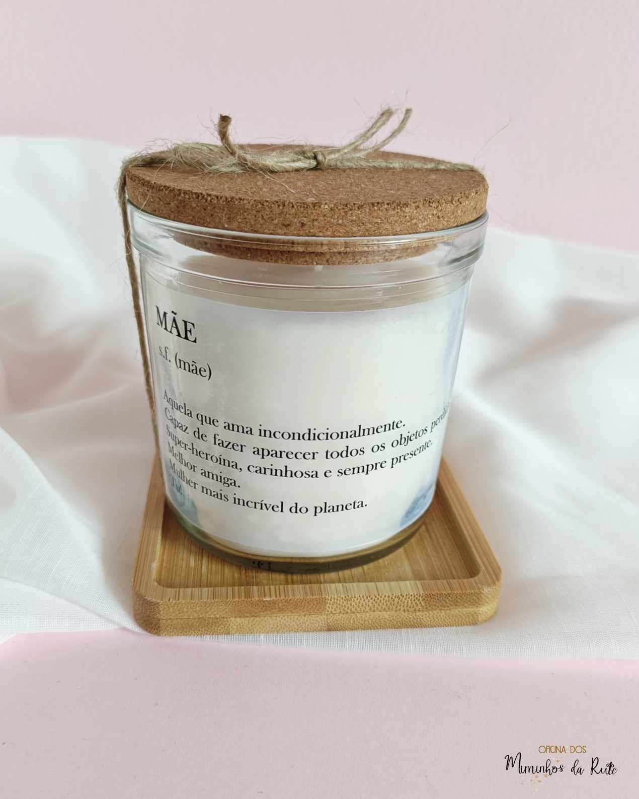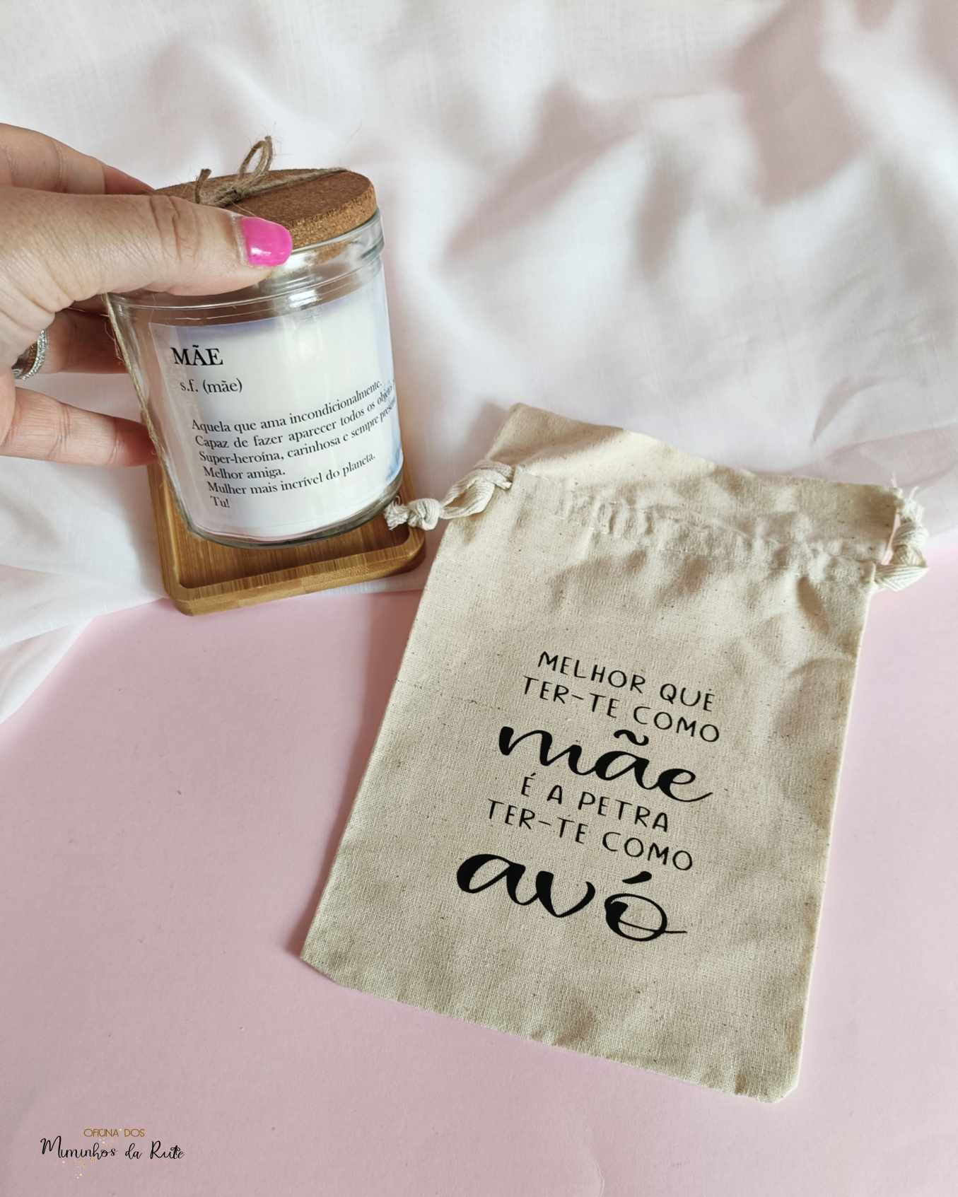 E sabes o melhor? É que tens a vela personalizada para a mãe, avó, madrinha, professora, educadora, auxiliar, etc e o saco pode igualmente ser personalizado com uma pequena frase como esta ou apenas o nome de quem recebe este presente afetivo 🩷
